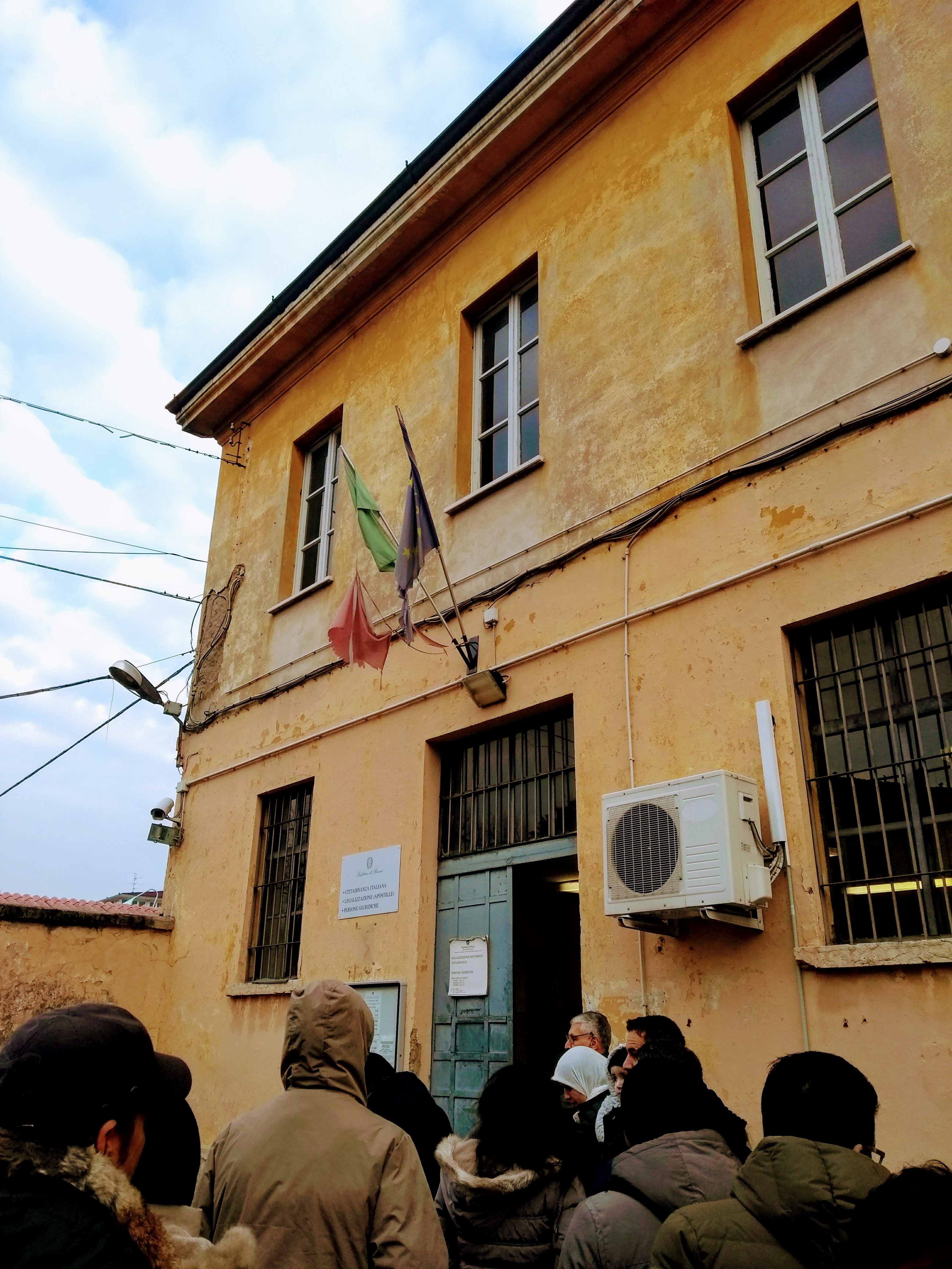 La Prefettura di Brescia, is an old, barely-repurposed military barracks which supposedly houses an office of the Ministry of the Interior. Surrounded by a high brick wall, we immigrants must line up outside, next to a busy road, at least an hour in advance of their opening, for they only entertain office hours for three days a week, three hours at a time. Similar to the Questura, there are about fifteen people here before us, and many attempts at newcomers to jump the line.